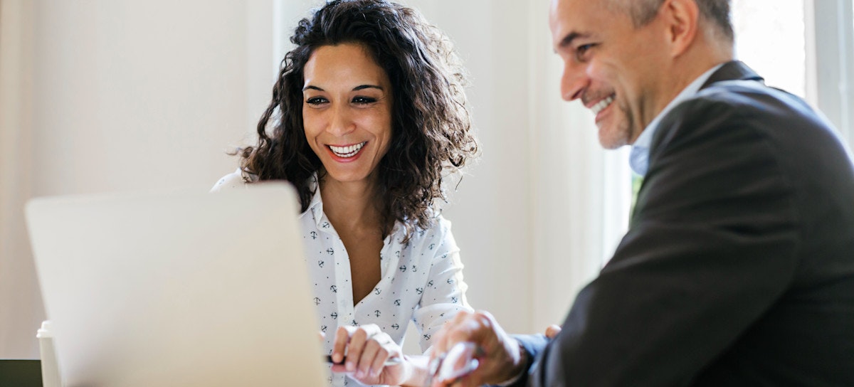 [Featured Image] Two colleagues sit at a computer and discuss the advantages of Hadoop vs. Spark.