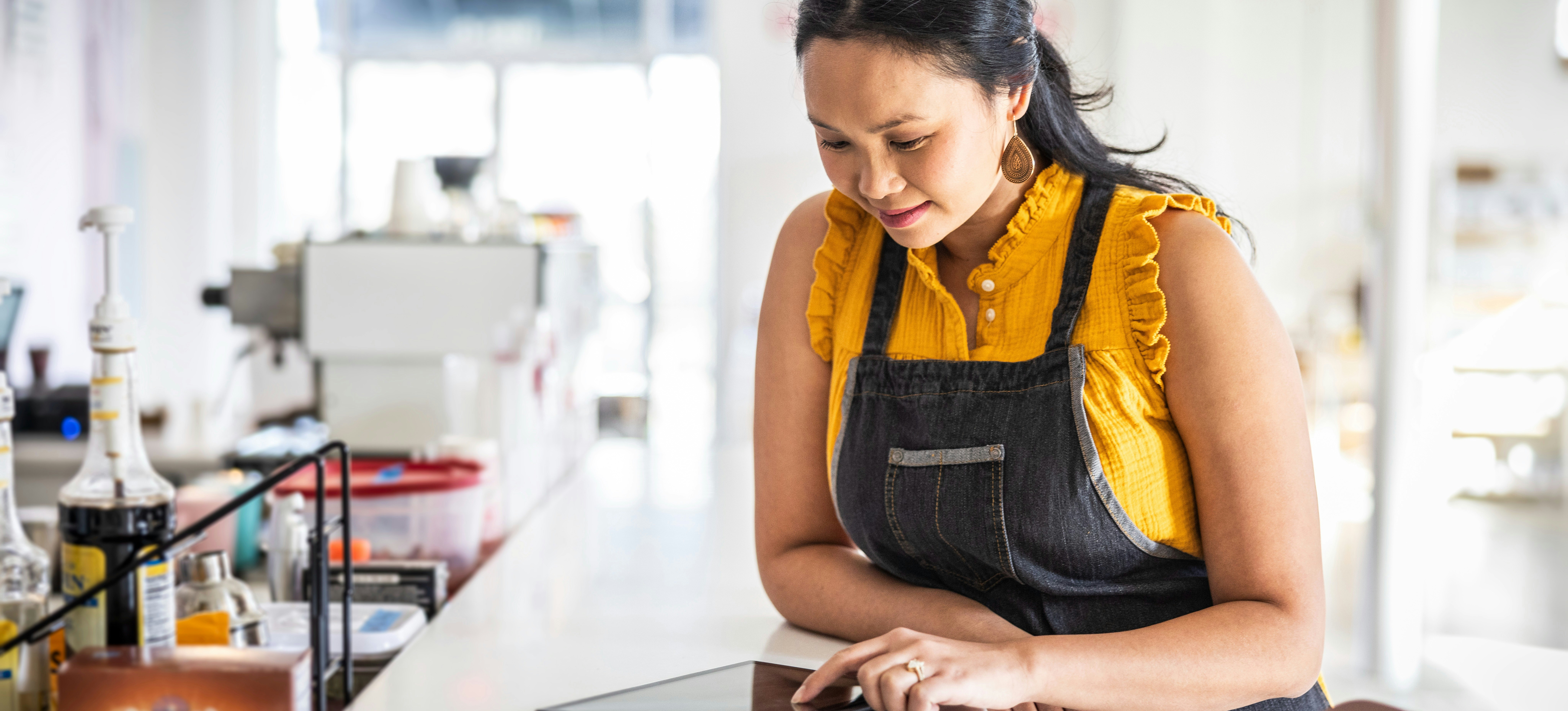 [Featured Image] A business owner analyzes retail analytics on their tablet.