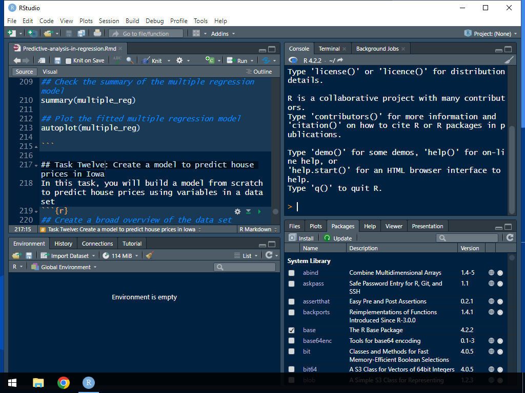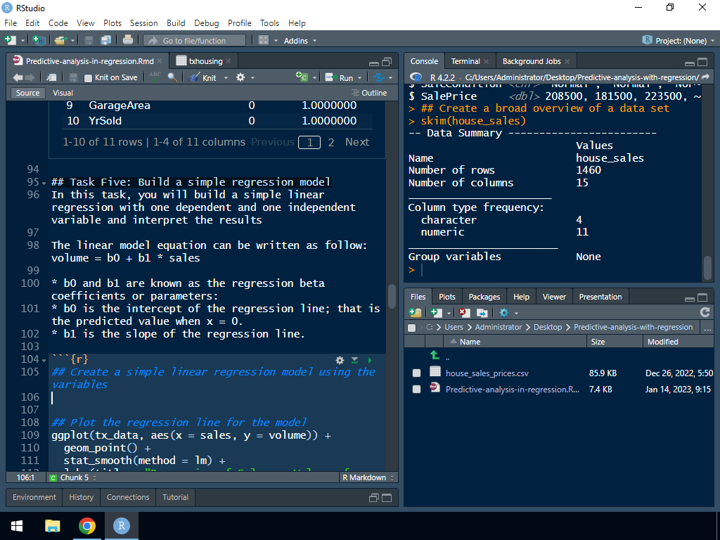 De plus en plus, l'analyse prédictive façonne les décisions des entreprises en matière de ressources limitées. Dans ce projet, vous construirez un modèle de régression pour faire des prédictions. Nous commencerons ce projet pratique en explorant l'ensemble de données et en créant des visualisations pour l'ensemble de données. À la fin de ce projet de 2 heures, vous serez en mesure de construire et d'interpréter les résultats d'un modèle de régression linéaire simple en R. Vous apprendrez également à effectuer des évaluations de modèles et à vérifier les hypothèses à l'aide de diagrammes de diagnostic. Par extension, vous apprendrez à construire et à interpréter les résultats d'un modèle de régression linéaire multiple. Pour réussir ce projet, vous devez être familier avec l'utilisation de R pour décrire des données. Si vous n'êtes pas familier avec R et que vous souhaitez en apprendre les bases, commencez par mon précédent projet guidé, "Getting Started with R" Cependant, si vous êtes à l'aise avec l'utilisation de R, rejoignez-moi pour cette belle et passionnante balade ! Mettons-nous les mains dans le cambouis !