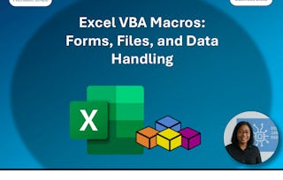 This course will be useful to anyone who wants to gain the skills necessary to use Visual Basic for Applications (VBA) to automate tasks in Excel such as collecting data from external sources, cleaning, and manipulating data. You will begin by identifying components of macro-enabled workbooks and configuring the Excel VBA environment. You'll also automate repetitive tasks by using the macro recorder, recording a macro with relative addressing, deleting macros and modules, and identifying strategies for using the macro recorded. Then, you'll use VBA help, use the object browser, and use the immediate window to explore object properties and methods.
