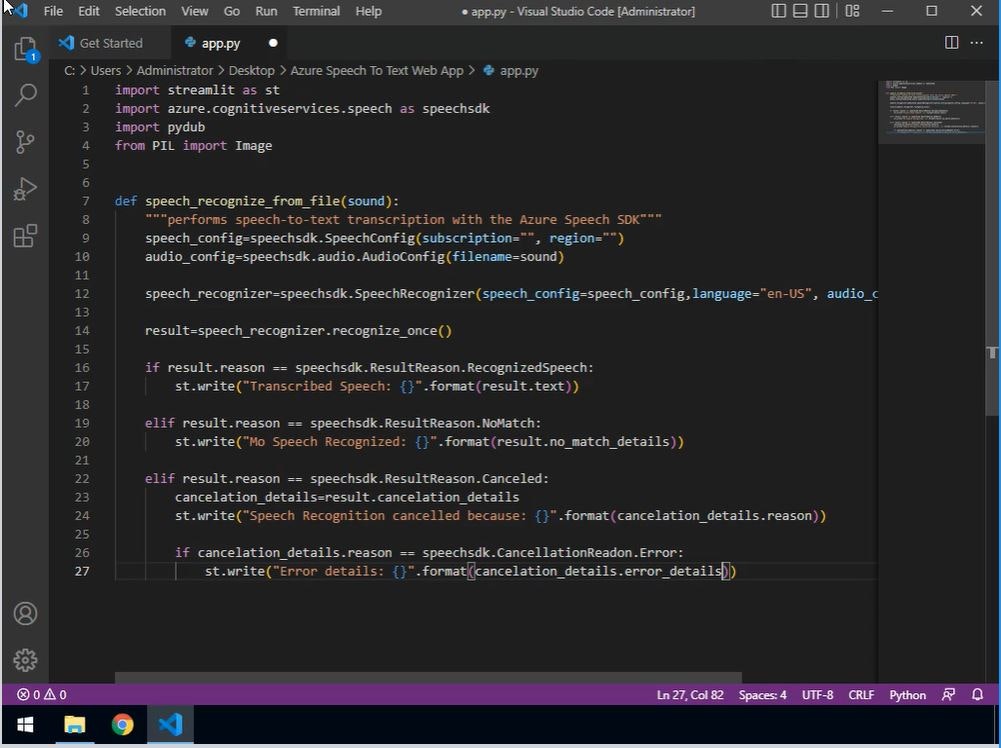 In this 2-hour-long project-based course, you will learn how to import the necessary python modules for Azure Speech to Text SDK, Create a function to transcribe audio to text, Build a web app using Streamlit and deploy the web app to Heroku.